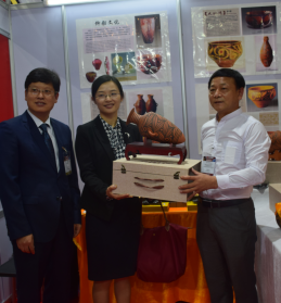 中國駐泰國大使館參贊煅煉女士親臨展會現(xiàn)場,并收藏了劉新安制作的彩陶代表作《小口尖底瓶》